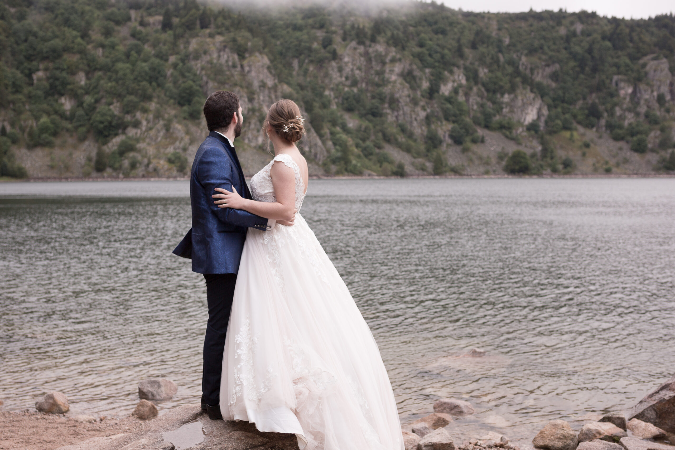 Nous avons ensuite pris la route vers le Lac Blanc pour ajouter une ambiance plus sauvage à leur séance. Au fil de la montée, la météo s’est refermée sur nous, la lumière plus mystérieuse. Arrivés en altitude, nous n’avons finalement pas pu faire de photos : la visibilité était totalement bouchée, comme un jour d’automne en plein mois d’août. Mais ce contretemps n’a rien enlevé à la beauté du moment. Le trajet nous a permis de partager encore nos anecdotes de voyage, de rire ensemble. J’adore ces moments de covoiturage avec mes mariés, où l’on crée des souvenirs qui ne sont pas sur les photos, mais qui font pleinement partie de l’expérience.