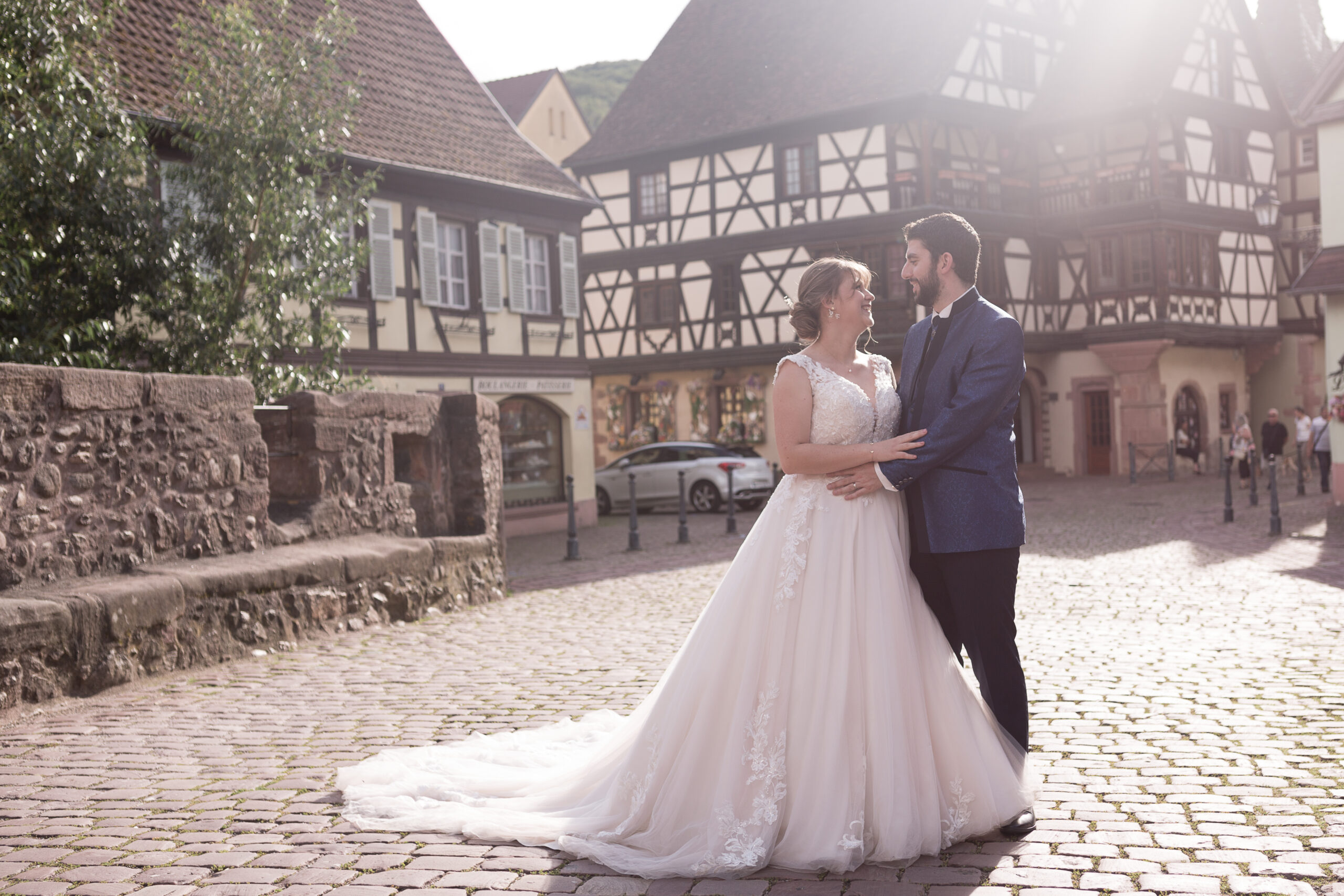 Quelques semaines après le mariage, nous avons réalisé leur séance day after, un moment plus calme, plus intime, où l’on prend le temps de prolonger la magie. En tant que photographe de mariage en Alsace, j’aime proposer à mes couples des lieux qui leur ressemblent vraiment. Ensemble, nous avons donc réfléchi au coin d’Alsace qui ferait écho à leur histoire. Je leur ai suggéré le Haut‑Rhin, du côté de Kaysersberg : ses maisons typiquement alsaciennes, le charme de ses ruelles et les vignes qui entourent le village offrent un décor idéal pour une séance photo de couple authentique et chaleureuse.